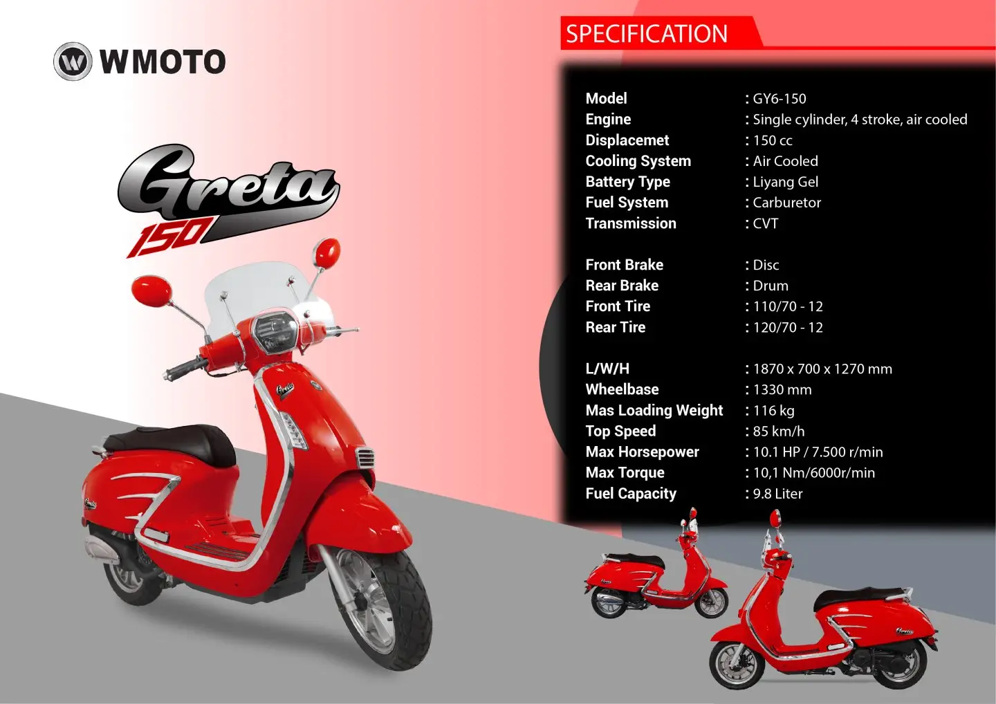 Greta Tampil beda dengan gaya klasik modern dari WMOTO Greta 150. Ditenagai mesin 150cc yang responsif, skutik ini hadir dengan desain membulat ala retro yang dipadukan fitur kekinian seperti lampu full LED, Smart Key System, serta panel speedometer kombinasi analog dan digital.